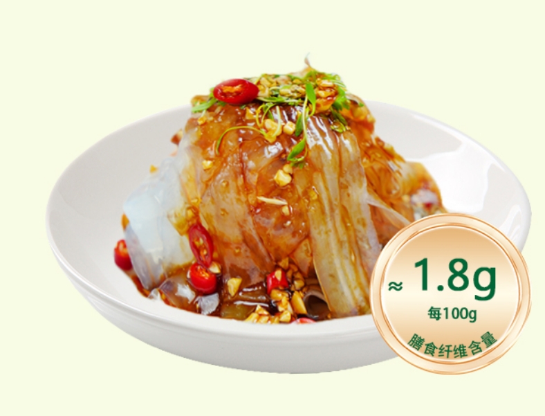 每100g膳食纖維含量在1.8g仿傳統(tǒng)涼皮口感,爽滑彈牙,開袋即拌,夏日消暑輕食,減脂期也能大快朵頤